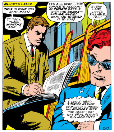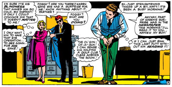 Daredevil has tended to mix and match these various portrayals of Foggy over the course of its thirteen episodes. There are faint traces of the Stan Lee and Bill Everett version to be found in the very faint teases of a romantic triangle between Matt, Foggy and Karen in episodes like World on Fire. Indeed, when Karen made a romantic move on Foggy by asking Foggy to touch her in the way that Matt would touch her, it perfectly encapsulates the insane creepiness of every Marvel Silver Age romantic triangle ever.