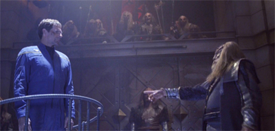 Judgment aired in April 2003, less than a month after the United States invaded Iraq. It is quite a brave episode to air in that context, because it consciously positions the Klingons as the obvious stand-ins for contemporary United States. Patriotism and pride are just tools to be exploited in the construction of compelling narratives. In Duras’ account of events, he is sure to portray Archer as a threat to the very fabric of Klingon society. It is a delightfully transparent piece of playing to the gallery, but it feels no more surreal than “freedom fries” or “freedom toast.”