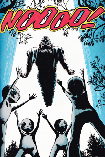 There is a wonderful contrast between the portrait of southern life captured by Petrucha’s script and the intrusion of aliens and men in black. A lot of the elements of Afterflight might easily be structured into a more conventional dramatic story, with the men in black ultimately revealed to be executives seeking to exploit Professor Wilson and Clyde trying to pry lucrative secrets from the increasingly impaired old man. There is something fascinating about seeing elements of The X-Files intrude into this story, suggesting a more fantastical world than the characters realise.