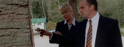 The actual case at the heart of Detour feels almost incidental. The script takes the greatest pleasure in celebrating the dynamic between Mulder and Scully, treating it as a very deep and abiding bond. Their real-life experience of trust and teamwork is contrasted with the buzzword-driven pop psychology of the teamwork seminars attended by Kinsley and Stonecypher. Kinsley and Stonecypher joke about building a tower out of furniture, while Mulder and Scully are forced to consider building a tower out of bodies.