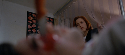 It doesn’t help that the plotting of the episode seems to treat Scully’s vacation as a hilarious joke – a hilarious joke where the punchline is “an entire store full of people just gouged their eyes out.” The idea of cutting back to Mulder’s attempts to entertain himself works well in theory – with Scott Von Doviak suggesting in Stephen King Films FAQ that it might be a nice inside joke referencing the difficulties facing King and Carter as a writing team – but in practice it feels like a sit-com imposing itself upon an otherwise traditional horror story.