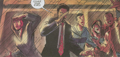 The second issue ends with the death of the fifth victim; by this point in the narrative, the viewer has seen this horror unfold three separate times for four different people. There is nothing particularly horrifying or striking about the death of Nancy Scheck that has not already been shown to the reader three times. It is the safest possible choice for a cliffhanger, certainly less effective than the use of a similar death as a hook at the start of the very first issue of this four-part miniseries.