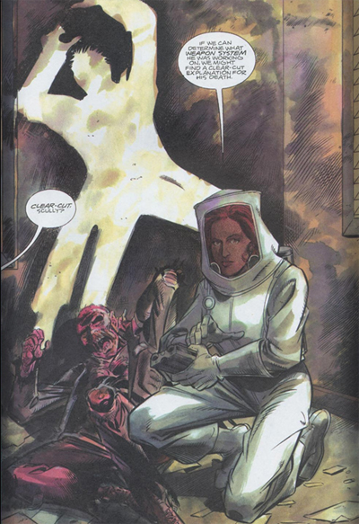There are other examples that suggest Anderson is not entirely comfortable with the comic book form. Notably, the cliffhangers to Ground Zero leave a lot to be desired. To be fair, they do improve as they go along. The final cliffhanger has Scully discover barrels and barrels full of human remains that are being smuggled to a nuclear test site; a haunting image that feels almost like something that belongs on Millennium rather than The X-Files. However, the other two cliffhangers are abysmal.