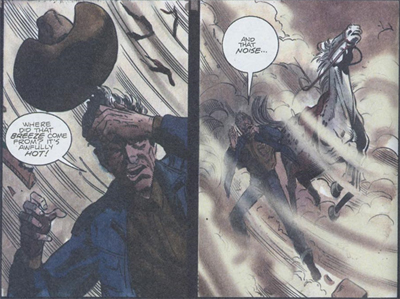 In fact, a lot of the more incongruous elements of Ground Zero would work better if Anderson were willing to employ caption boxes rather than dialogue bubbles. After leaving a general store, Oscar McCarron remarks to his horse, “Let’s get out of here… as far away as we can, just so I can let my nerves settle after dealing with that idiot.” This is just bland and generic exposition that is designed to explain why McCarron would wander into the site of the Trinity Test. It does not explain why he talks so profoundly to his horse.
