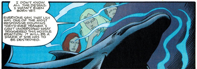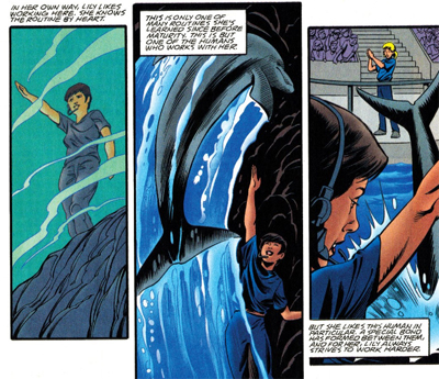 More than that, Scully offers the obligatory response that is designed to implicate the reader. “They’re no more arrogant than the rest of the human population… which isn’t to excuse them.” It is a cheap shot, particularly because Cam Rahn Bay is completely disinterested in exploring other issues around how human society treats and exploits dolphins. The comic never takes issue with the treatment of the dolphins at the aquarium, never wondering about the difference between training dolphins to save lives and training dolphins to entertain.