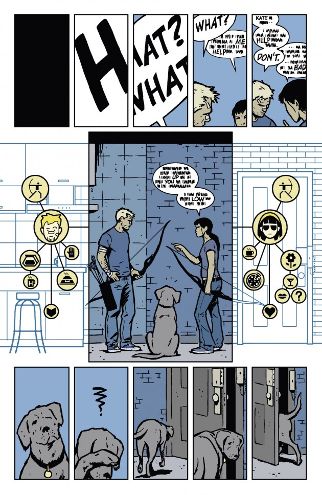 In 2014, for example, writer Matt Fraction and artist David Aja took home an Eisner Award for their work on Hawkeye #11. The comic book was essentially told from the perspective of Lucky the “pizza dog.” It followed the canine detective as he attempted to solve a murder. The comic invited the reader to experience the world as seen by Lucky, conveying associations and hearing particular words rather than sentences. The reader was invited to imagine what the human world might look like to a creature like Lucky.