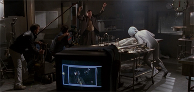 The decision to incorporate an obvious stand-in for The X-Files into the story also feels a little bit on-the-nose, even if it does allow for the wonderful sight of actors in dodgy alien costumes waving Uzis around. Still, Morgan manages to keep things moving along. The writer and director has a clear taste for broad slapstick comedy; little incongruous details like the toilet in the middle of the soundstage speak to Morgan’s attention to detail. The piece moves quickly enough, and is over fast enough, that it never outstays its welcome.
