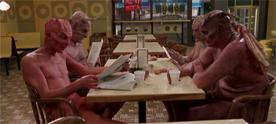 In terms of style and structure, Somehow, Satan Got Behind Me is a rather ambitious piece of work. It is a rather unusual episode of Millennium. Frank Black barely appears in the episode, having only a handful of lines. Indeed, Frank serves as the primary link between the four short stories told by a quartet of demons who meet to enjoy an early-morning coffee in Seattle’s “Donut Hole.” Instead of focusing on Frank, Somehow, Satan Got Behind Me is framed around four one-shot guest characters who each offer their own take on mankind and damnation.