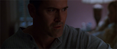 It is an interesting and nuanced performance, and one that stands out among the rest of Campbell’s filmography. Campbell has a tendency to dominate media in which he appears, to shew mercilessly on the scenery and own every frame that holds his image. Campbell’s performance style is typically as mannered and self-aware as that of actors like William Shatner or Clayton Rohmer. Campbell’s traditional style would fit comfortably with the heightened absurdity of something like Triangle, Dreamland, How the Ghosts Stole Christmas or The Rain King.