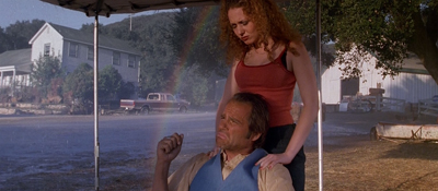 The episode’s closing image reinforces this, looking like something taken from a post card. All the signifiers of rural America are there; the clear blue sky, the bountiful fields, the rustic barn. The Rain King even adds to this idyllic image, offering the sight of a rainbow and the sound of Judy Garland singing Somewhere Over the Rainbow. It looks like the sort of wholesomely all-American image that Glen Morgan and James Wong subverted so effectively in the teaser to The Time is Now.