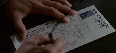 Vince Gilligan and John Shiban reinforce this idea in a number of ways. For instance, Scully repeatedly informs Mulder that the meeting is still going on – but in a slightly different way each time. When Bernard prepares his ransom note in the bank, the wording is unique to each iteration. (Swapping out “holdup” for “robbery”, for example.) The first time through the loop, Mulder trips forwards over his shoes; the second time, Mulder trips backwards. Monday very clever and very efficiently sets up its rules about time loops.