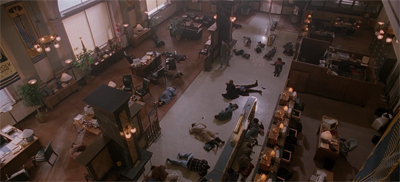 The end of history means that there is no future, that there is nothing beyond the “now.” The future is a recurring theme in Monday. Pam finds herself (and everybody around her) living the same day over and over again – struggling to reach the next day, but always ending up back where they started. It is heavily implied that Bernard is inspired to rob the bank because of his own difficulties envisioning a future. When Pam suggests that it is not too late for him to go to work, Bernard responds, “Who cares? Like there’s a big future in mopping floors. Like that’s something to lose.”