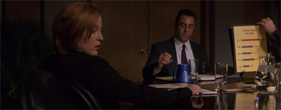 This bland sameness is reflected in the way that Monday captures the dull routine for Mulder and Scully. A recurring gag in the episode is that Mulder and Scully are late for a Kafka-esque meeting that never seems to end – Scully describes it as “the longest in FBI history.” The meeting, appropriately enough, concerns the future. The episode’s first cut to the meeting features an agent droning, “Now, that’s assuming these trends continue well into the coming year…” The future seems to be set. It is the same as it has ever been.