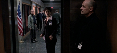 Even the little shots work very well. There is a beautiful shot after Peter makes his offer to Hollis in the elevator at the FBI building. Peter is in the elevator, in the foreground; Frank is in the hallway in the background. Hollis is caught between them, in the middle ground. It is a very simple shot, but one that arguably conveys a lot more than any of the dialogue in the episode. It hints at Emma caught between the two characters. The little touch of having the elevator close so Frank cannot see Peter really sells the moment.