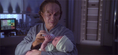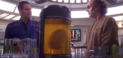 The whole cloning metaphor is skewed by the suggestion that it is an “all or nothing” process, that the only way to save Trip is to grow a replacement that attains consciousness and then has to be brutally butchered for spare parts. For a show about future possibilities, Star Trek can seem quite reactionary when engaging with key scientific issues. The franchise seems to react with knee-jerk horror to the idea of cloning or genetic engineering. Apparently it is easier to grow an entire replacement of Trip than it is to just clone the necessary tissue or raw materials quite separate from consciousness.