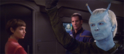 In a very real sense, it is more serialised than a lot of the episodes leading up to it. The episode even opens with a fairly sweeping “previously…” section that is sure to include a lot of nice action shots from the first half of the year. Proving Ground contributes more to the arc than anything like Carpenter Street or Chosen Realm, featuring the testing of the Xindi weapon. It also features the Andorians, suggesting that Star Trek: Enterprise has not completely divorced itself from its original place in the Star Trek canon.