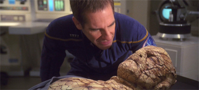 In many ways, Harbinger plays as a return to those earlier experiments in story structure. It is an episode that is not driven by story. Although the strange alien discovered by the crew provides a suitably dramatic climax, most of Harbinger is built around established character dynamics. Trip and T’Pol begin working through the sexual tension that has existed between them since the start of the third season; Reed and Hayes do something similar in a very different fashion. In the meantime, the ship just cruises along en route to the third season’s next big plot beat.