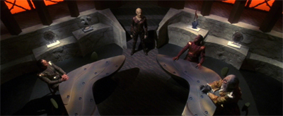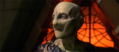 4. Well, I am happy to see Casey Biggs pop up here, because Damar is one of my favourite Star Trek characters of all time. He was one of the best arcs of any character in the franchise. Biggs is good at playing with his limited role so that we empathize with him. His alien makeup emphasizes his cranium rather than his jaw or neck, which sort of inverts the Carassian look. He is rounded, soft. His ship looks like a calm little manta-ray baby. I also like how the director shot the attack by Enterprise, inverting the usual framing of the show. Enterprise comes in overhead like a star destroyer all menacing.