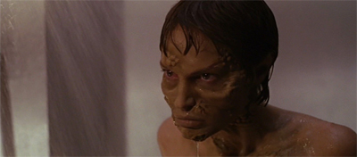 It becomes an excuse for the gratuitous shower scene, which is very much a call back to the worst excesses of the second season like Bounty. (Why do so many T’Pol-centric episodes focus on her as a sex object, as compared to episodes based around Archer or Trip?) Similarly, the decision to portray her drug addiction through outward monstrosity feels a little unfortunate. The idea that Vulcans affected by trellium-d physically transform was established in Impulse, but here it feels like an effort to dehumanise (or devulcanise) T’Pol as a drug user.