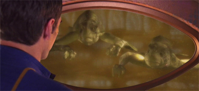 The aquatic!Xindi come into focus during the final three episodes of the season, and are consciously presented in a way that evokes the Guild Navigators from Dune; they sit in their tanks and seem to provide the transport infrastructure for the Xindi as a whole. Tellingly, Archer’s first encounter with the aquatic!Xindi comes when they shepherd him back to Enterprise in Damage, while they also help to transport Enterprise itself in both Countdown and Zero Hour. It feels like Star Trek is allowing itself to embrace a goofier science-fiction aesthetic.