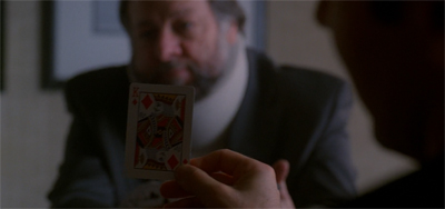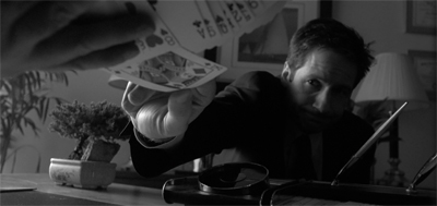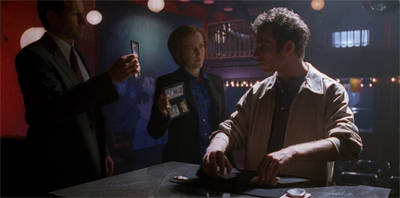 The problem is not the idea itself; the idea is as clever as building an episode about a caper around two huckster magicians. The problem is the execution of the idea. After all, LaBonge manages to get ahold of Mulder’s badge quite early in the episode; Maleeni gets Mulder’s thumbprint the first time that they cross paths. Why did LaBonge and Maleeni wait so long to execute their gambit? Why did they risk so much to set up Alvarez when they could simply transfer lots of money and get out of dodge? After all, the teaser establishes all that they need to execute the con.
