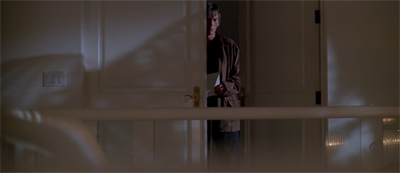 Manners isn’t at all concerned with these issues. As Robert moves does the stairs, he keeps the camera tight. In each of the subsequent shots, he reveals more to the audience than to Robert; the first glimpse of Irving reveals the wire hanging from the top of the screen, even if it is framed so only his upper body is in shot. As Robert goes closer, it becomes clearer and clearer to any horror savvy audience (but not to Robert) that Irving is hanging. Inevitably, Robert turns Irving around to reveal that he is hanging and his slit throat.