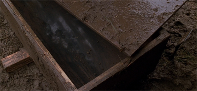 The edit is quick and tight; the audience sees the body saw and the blood on Irving’s throat. It is creepy and effective. The quick cut is haunting on its own terms, hinting perhaps at a more subtle “flash of horror” approach. However, Manners’ direction shifts from suspense into something more visceral. The sequence hits the viewer very quickly with shots that do not disguise or downplay their gore. A pool of blood magically appears so Robert can slip in it. When Robert scrambles to turn on the light, we don’t see a flash of Irving hanging; we get a long and lingering shot.