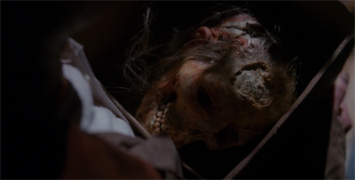 It is a very effective technique, with Manners teasing an effective and minimalist approach to horror. The sequences build up suspense about the slow reveal of something deeply unpleasant; these sequences are edited in a way that suggests restraint, as if the horror is to be left implied. However, as soon as Manners is done implying the horror, he then candid shows it. The same thing happens during the “poppin’ corn” sequence, where most of what actually happens to Nan is obscured through editing, suggesting it will be left implied. Then Manners focuses on the body.