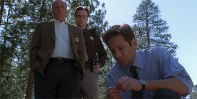 Time is an important part of Requiem. In The Pilot, Mulder and Scully experienced nine minutes of missing time when they visited the community. In Requiem, time is not so much missing as distorted. It seems to fly by, metaphorically and literally. “I’ve never thought of myself as a cop but it’s been three years now,” Billy boasts. Scully greets him like a young relative all grown up. “You’re married, Billy.” The distortions around the crashed ship only accelerate the sense of time passage; watches spin out of control and bodies move as blurs.