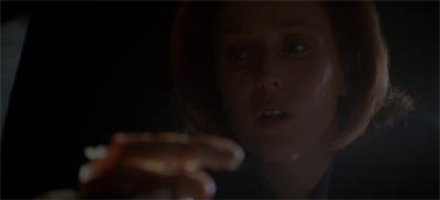 “I say that assumption is the problem here,” she reflects upon examining the evidence at the crime scene. “Maybe this print can help explain those bite marks.” Scully is also more professional (and quieter) in dealing with skepticism. “I think that post-mortem predation is definitely a consideration here,” she allows. She then politely, but firmly, rebukes the idea, “But I only see one print and if it were an animal there would be numerous prints all over here and in the yard.” Scully is still Scully, she is not Mulder.
