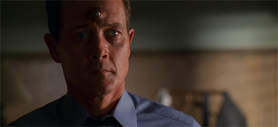 When Tipet (and later Doggett) take on a third eye, he incorporates an aspect of the divine into himself. The destruction of those third eyes by way of axe represents a repudiation of that divinity. More than that, the Lone Gunmen suggest that the horrific wounds on the victims are actually wounds done to the inner self that are then projected on to the body. “The assassin makes his victims think they’re being hit by an axe,” Langly suggests. Frohike finishes the thought, “They believe it… it happens.” The internal self manifests upon the world.