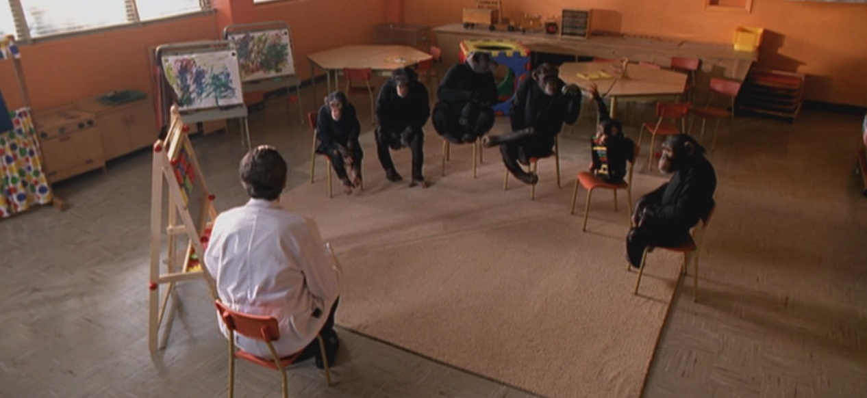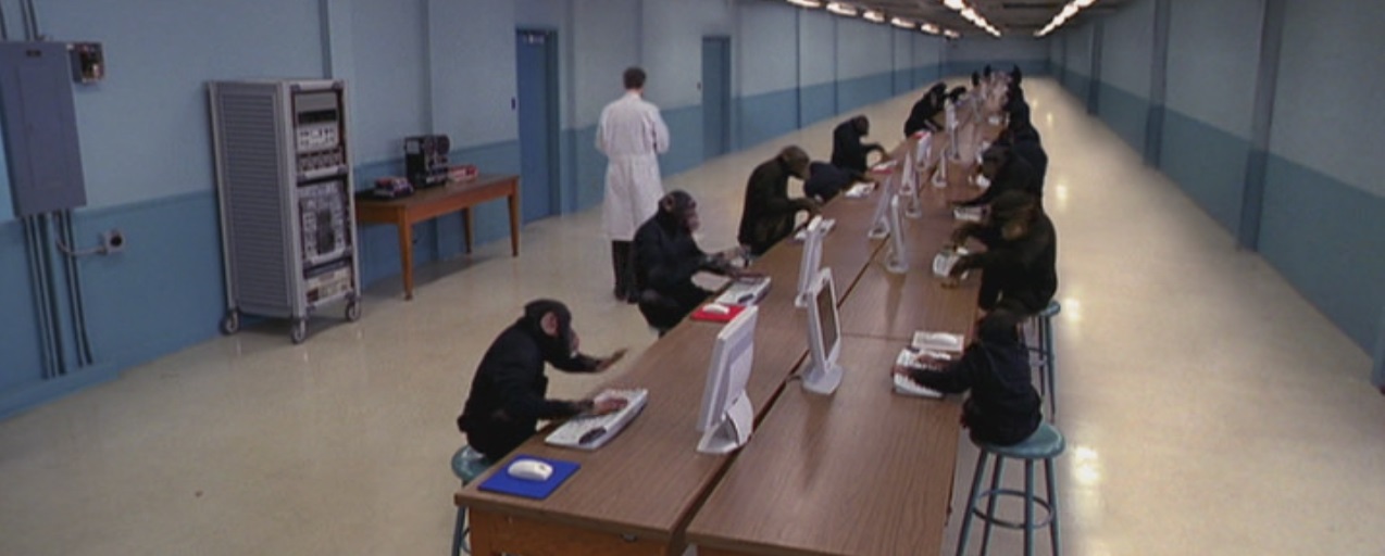 The opening scene is, of course, a riff on a classic thought experiment. As Jorge Luis Borges outlined in The Total Library, the image of a monkey with a typewriter is tied to a particular stream of thought: