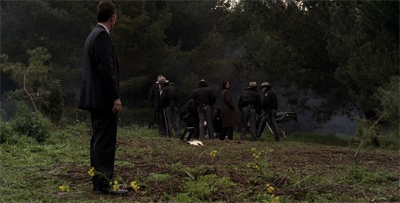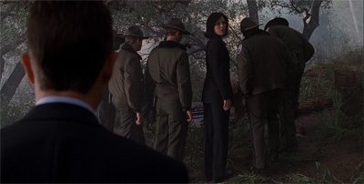 One of the shrewder elements of Empedocles is the way that it echoes and mirrors various incidents around it. The flashback sequences charting the discover of Luke Doggett are framed in such a way as to mirror the discovery of Mulder’s body at the climax of This is Not Happening. Law enforcement officials stand around awkwardly in a circle in a wooded area while waiting for somebody close to the deceased (another law enforcement official) to identify the body. It is powerful imagery.