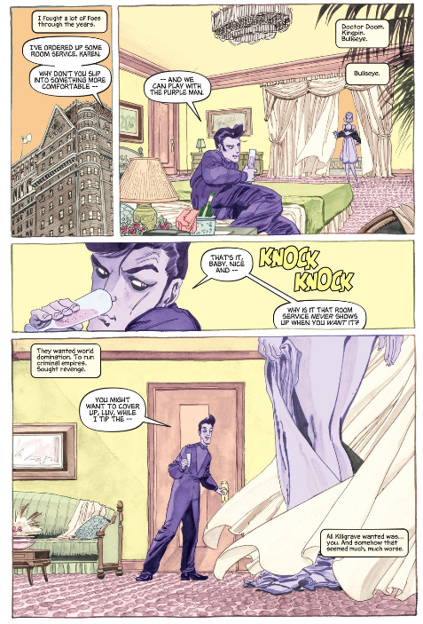 As early as his first appearance in Daredevil #4, there had been something distinctly creepy about Killgrave’s interest in Karen Page. Using his mind control powers, he walked out of prison taking Karen Page with him. In Daredevil #4, Matt Murdock is able to catch up with Kilgrave before anything vaguely inappropriate could be implied to have occurred between the Purple Man and his new “assistant.” In contrast, Daredevil: Yellow allowed Killgrave to get Karen back to a hotel room as Matt made it explicit that Killgrave was a sexual predator.