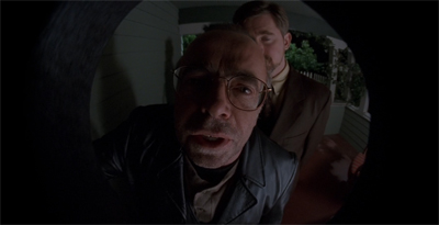 Thanks to Nothing Important Happened Today II, even the relationship between Doggett and Kersch is defined by their separate relationships to Mulder. When Kersch suggests that he is secretly assisting Doggett, Doggett rejects the idea out of hand. “Now, why would I believe that you’d help me?” Doggett asks rhetorically. “Agent Mulder believed me,” Kerch suggests, as if the mere dropping of Mulder’s name is enough to establish bona fides. It doesn’t matter that the character beat makes no sense, Kersch said the magic word.