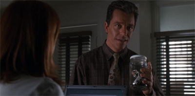 It is perhaps a sign of how The X-Files transitioned from a hungry young show to a part of the conservative television establishment that it has gone from having Mulder and Scully appear on The Simpsons to having Doggett complain about the stupid kids on their stupid shows. “I think I just solved this case,” he boasts. “This kid had crap for brains and the flies couldn’t resist.” He clarifies, “This isn’t just stupid, this is glorification of stupid. These kids take enormous pride in being sub-mental.” Get off his lawn, MTV.