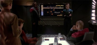 “The Klingons have also attacked three more outposts along the Romulan border,” Dax warns the briefing. “In short, they’re reasserting themselves all over the quadrant.” Kira provides some nitpicking, pointing out that The Way of the Warrior was hardly an unqualified victory. “You’d think they’d be a little less aggressive after failing to conquer Cardassia.” Worf counters, “If the invasion was seen as a failure, Gowron would have been assassinated by now. He simply declared victory and returned home.” Imagine Gowron with a “mission accomplished” banner.