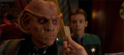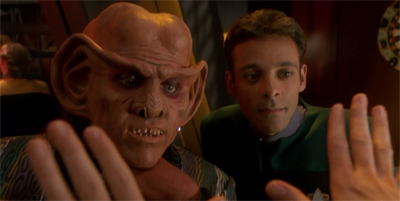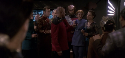 I wonder why Bashir gets a ringside seat in that picture? So it was Tobin and not Joran who knew magic tricks? Oh wait, that was the actor who played Joran and not the character itself. Dax shouldn’t hug Lenara in front of her future husband. I’m sure Bashir wants to gouge his eye out with that fork and then move on to the more vital areas in that picture.