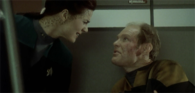 In some ways, Rejoined can be read as a response to the closing scene of The Host. In the episode that introduced the Trill to the Star Trek universe, Beverly Crusher could not continue a relationship with the symbiont she loved once that symbiont was placed in a female body. (As if to underscore the possible homophobic subtext of it, Beverly was more comfortable – if still weirded out – when the symbiont was placed in Riker.) It seems like it is not what is inside that matters when it comes to love. Rejoined essentially reverses this, suggesting love is more than skin deep.