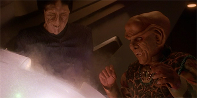 “At the request of the Karemma Commerce Ministry, we’ve brought the Defiant to a remote system in the Gamma Quadrant to discuss problems that have surfaced regarding our recent trade agreement,” Sisko states in his opening log, making it clear that this is not something with which the Dominion would be comfortable. Hanok explains the need for subterfuge, “When we first agreed to use the Ferengi as intermediaries, we did it because we knew the Dominion would never tolerate direct trade between us and the Federation.”