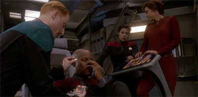 Certainly, the script plays rather heavily on submarine movie conventions. Once in the atmosphere, the crew are informed that sensors are useless. Kira proposes a solution. “Sometimes we’d evade the Cardassian ships by hiding in the Badlands,” she recalls. “Sensor range was limited, so we learned to use an old active-scan system to navigate.” The effect is visualised on various monitors so as to evoke sonar scanning. Pulses fire out from the ship in a circular pattern, hoping to hit any enemy vessel so as to expose their location.