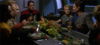 It’s yet another Voyager idea which makes you go ‘aha’, but probably doesn’t translate as well to the screen. (the fifth season episode “Once Upon a Time” is trying for a fairytale feel. But in the end, it’s the same studio jungle backdrop and rubber suits we’ve grown used to.) The show’s reach exceeded it’s grasp at times.