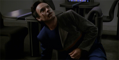 Of course, they could just be an effective piece of horror movie iconography reflecting Braga’s personal interest in the genre. Much like the effectively atmospheric sequence of Torres’ blood dripping on Janeway, it helps to create a suitably macabre mood. One of the more interesting (and quite often overlooked) aspects of the first two seasons of Voyager is the emphasis on the horror and brutality of travel in deep space. The Vidians are truly horrific aliens, but they are not the only ones.