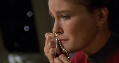 However, over the course of the episode, Janeway comes to gradually accept the role of Ralkana in her dealings with Caylem. She never stops being Kathryn Janeway, but she also understands that she can be what Caylem needs her to be. Their final moments are spent together with Janeway fully assuming the role of Ralkana and offering Caylem the forgiveness that he so sorely needs. She never gives up on her crew, she never shrugs off the responsibilities of command. She never stops being a captain, even when she takes on the role of loving daughter.