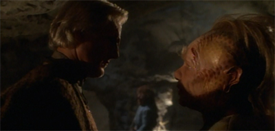 There is something quite reactionary about all of this, as if Alliances is suggesting that the Kazon were better kept enslaved. Even allowing for the end of the episode, the script is sympathetic to Mabus and the Trabe. “Most of the Trabe who persecuted the Kazon are either dead or old men by now,” Mabus tells Janeway over dinner. “Most of us were children when the uprising occurred, and our children are innocent, but the Kazon’s desire for revenge is as strong as ever.” He makes it sound almost unreasonable that the Kazon would harbour resentment and anger.
