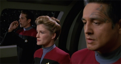 Alliances itself has some issues that result from botched serialisation, even if it is only really setting the larger arc in motion. Most obviously, the idea that the Kazon attacks on the ship are taking their toll on crew morale seems to come out of nowhere. Crew morale seemed pretty okay in Resistance and Prototype; it certainly doesn’t take a knock in Threshold. This is the first indication that the show has given of a recurring Kazon threat since Manoeuvres. (Which, of course, reopens the whole “how big is Kazon space?” or “how slow is Voyager moving?” debate.)