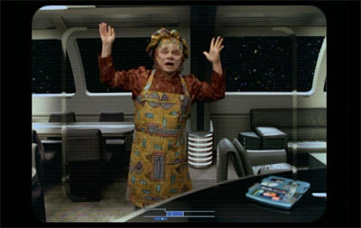 The script is a choppy mess, with contrived events unfolding as the plot needs them rather than in an organic fashion. The teaser not only introduces the concept of “A Briefing with Neelix”, but has Harry tease Neelix about “all the frosting” before telling Neelix that it is “the job of a journalist to be independent.” All of these points become immediately relevant when Neelix receives a communication that spurs the plot to action by revealing that Tom Paris is leaving the ship.