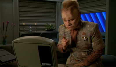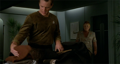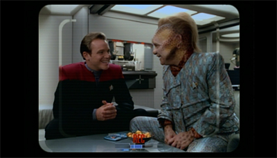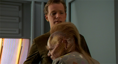 That clumsiness is evident even in the scheduling choices. There was a week break in the broadcast schedule between Lifesigns and Investigations, somewhat breaking the momentum of the arc on original broadcast. As Kenneth Biller complained to Cinefantastique:
