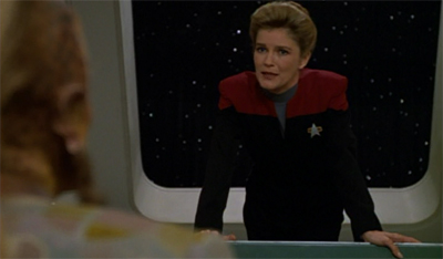 Now there is the story. Never mind that Tuvok jumped right on the “it must be a Maquis, it could never be a Starfleet officer” train of thought. Janeway appointed Chakotay to serve as her first officer; that is a position that requires trust between both parties. Janeway’s willingness to sacrifice that for “a good performance” violates that trust in an incredibly profound manner. It suggests that all the schisms between the Maquis and the Starfleet crew should be torn open; despite what she might claim, Janeway doesn’t trust Chakotay or his crew.