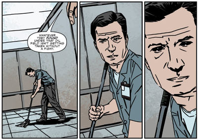 Some of that is down to the arrival of artist Matthew Dow Smith, who takes over regular art duties from Michael Walsh. Like Walsh, Smith has a style that is very heavy on atmosphere and tone. It is not overly detailed or photorealistic. Whereas Walsh tended towards a style that was almost cartoonish and animated, Smith is a bit murkier. His lines are heavier, and his panels are dominated by shadow. Even in the sunny surroundings of Saudi Arabia, Smith’s inking suggests the general aesthetic of the show’s Vancouver era.